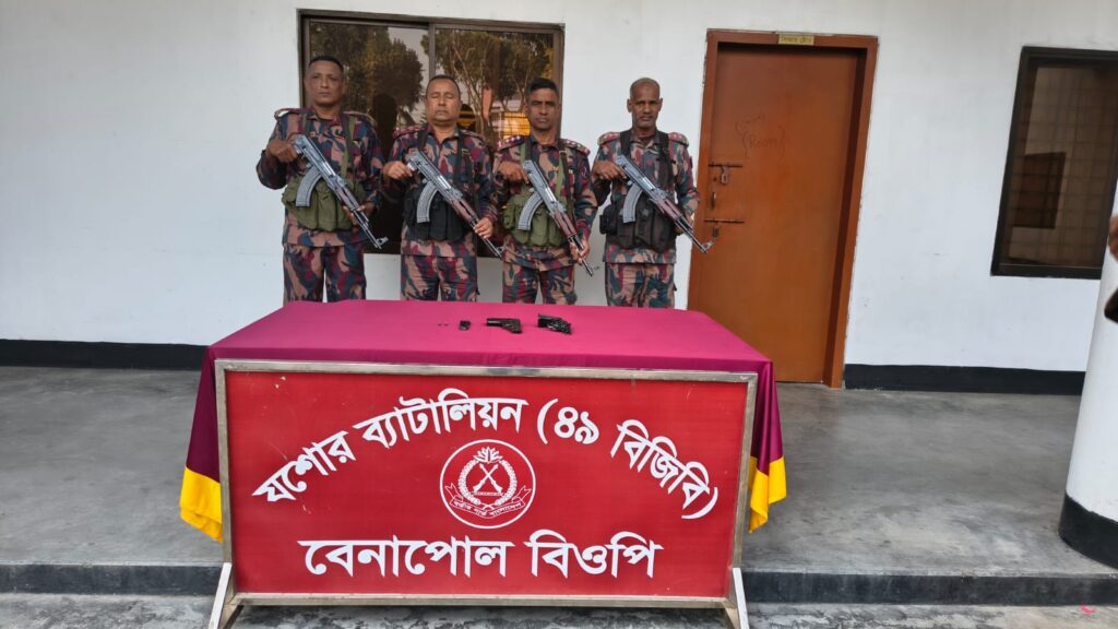 বিজিবি সূত্রে জানা যায়, সোমবার (০৯ ফেব্রুয়ারি) ভোর আনুমানিক ০৪০০ ঘটিকায় বেনাপোল বিওপির সুবেদার মোঃ আজিজুর রহমানের নেতৃত্বে একটি বিশেষ টহলদল যশোরের শার্শা উপজেলার বেনাপোল পোর্ট থানাধীন সীমান্ত এলাকা থেকে প্রায় ১ কিলোমিটার বাংলাদেশের অভ্যন্তরে গাতিপাড়া গ্রামে অভিযান পরিচালনা করে। অভিযানে ফজলে করিম ওরফে বুড়োর বাড়ির পরিত্যক্ত গেইটের ভেতরে বিশেষ কায়দায় লুকানো অবস্থায় ০২টি বিদেশি পিস্তল, ০১টি ম্যাগাজিন এবং ০২ রাউন্ড (ভিএল) গুলি উদ্ধার করা হয়।