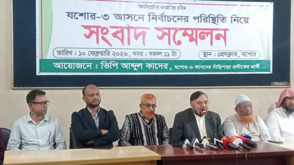 যশোর-৩ (সদর) সংসদীয় আসনে নির্বাচন পরিস্হিতি নিয়ে দাঁড়িপাল্লা প্রতীকের প্রার্থী ভিপি আব্দুল কাদের সংবাদ সম্মেলন করেছেন। আজ দুপুর ১টায় যশোর প্রেসক্লাবে ওই সংবাদ সম্মেলন অনুষ্ঠিত হয়।