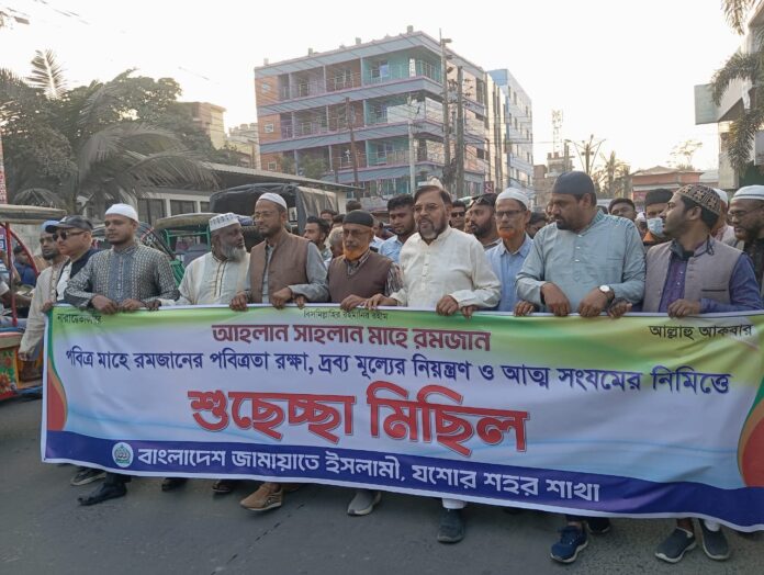 পবিত্র মাহে রমজানকে স্বাগত জানিয়ে যশোরে মিছিল ও সমাবেশ করেছে বাংলাদেশ জামায়াতে ইসলামী।বুধবার আছর নামাজের পর শহরের কেন্দ্রীয় ঈদগাহ ময়দান থেকে মিছিলটি শুরু হয়ে বিভিন্ন সড়ক প্রদক্ষিণ শেষে চৌরাস্তা মোড়ে গিয়ে শেষ হয়। এ সময় নেতাকর্মীরা মাহে রমজানের তাৎপর্য তুলে ধরে বিভিন্ন স্লোগান দেন । রমজানের শিক্ষা ব্যক্তি ও সমাজ জীবনে বাস্তবায়নের আহ্বান জানান।