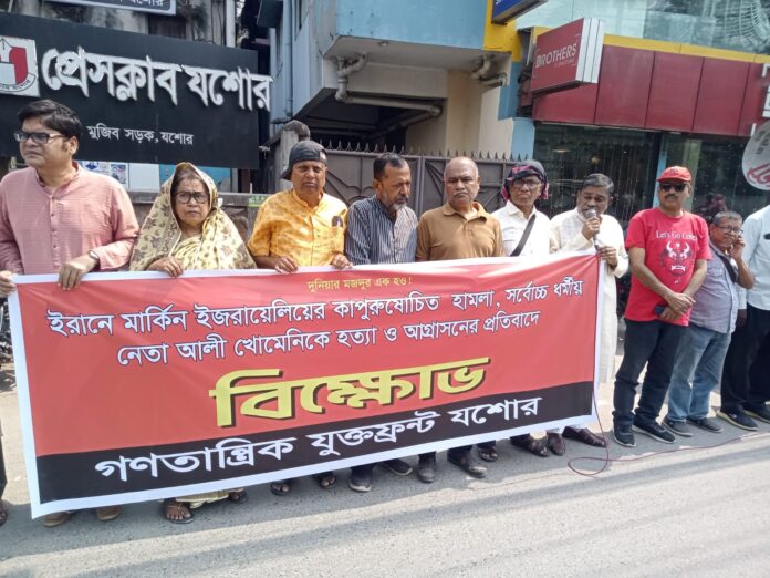 ইরানের ওপর মার্কিন যুক্তরাষ্ট্র ও ইসরায়েলের হামলার প্রতিবাদে যশোরে বিক্ষোভ সমাবেশ করেছে গণতান্ত্রিক যুক্তফ্রন্ট, যশোর জেলা। বৃহস্পতিবার বেলা ১২টায় প্রেসক্লাব যশোরের সামনে এ সমাবেশ অনুষ্ঠিত হয়।