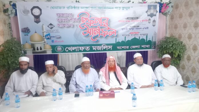 যশোরে খেলাফত মজলিস জেলা শাখার উদ্যোগে রমজানের তাৎপর্য শীর্ষক আলোচনা সভা ও ইফতার মাহফিল অনুষ্ঠিত হয়েছে। শনিবার বিকেলে পার্ক ভিউ কমিউনিটি সেন্টারে আয়োজিত এ মাহফিলে প্রধান অতিথি হিসেবে বক্তব্য রাখেন খেলাফত মজলিসের সিনিয়র নায়েবে আমীর ও হেফাজতে ইসলাম বাংলাদেশের কেন্দ্রীয় নায়েবে আমীর মাওলানা সাখাওয়াত হুসাইন।