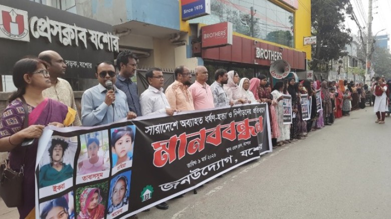 সারাদেশে অব্যাহত ধর্ষণ, হত্যা ও নারী নিপীড়নের প্রতিবাদে উত্তাল হয়ে উঠেছে যশোর। এসব অপরাধের বিরুদ্ধে কঠোর আইন প্রয়োগের পাশাপাশি সামাজিক প্রতিরোধ গড়ে তোলার আহ্বান জানিয়েছে নাগরিক সংগঠন ‘জনউদ্যোগ’ যশোর।