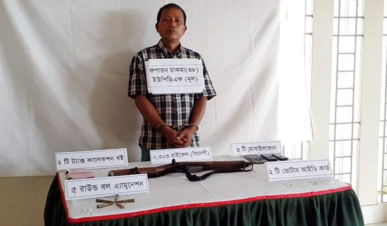 এ সময় তার কাছ থেকে একটি বিদেশি থ্রি নট থ্রি রাইফেল, পাঁচ রাউন্ড বল এ্যামুনেশন, তিনটি মোবাইল ফোন, দুটি চাঁদা আদায়ের রশিদ ও দুটি আইডি কার্ড জব্দ করা হয়।