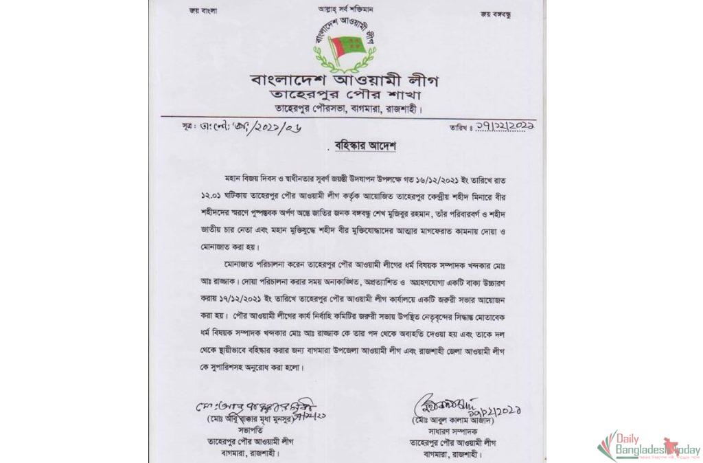 তাহেরপুর পৌর আওয়ামী লীগ সভাপতি আবু বাক্কার মৃধা মুনসুর ও সাধারণ সম্পাদক আবুল কালাম আজাদ তার বহিষ্কারাদেশে স্বাক্ষর করেন। তাকে স্থায়ী বহিষ্কারের জন্য বাগমারা উপজেলা ও জেলা আওয়ামী লীগের কাছে সুপারিশ করা হয়েছে।
