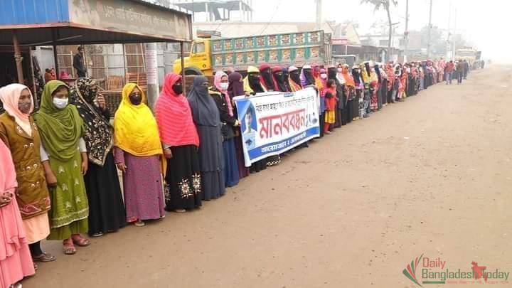 ঘন্টাব্যপীচলা উক্ত মানবন্ধনে এলাকার পাঁচ শতাধিক নারী-পুরুষ অংশগ্রহন করেন। গত ১৮জানুয়ারী বিকেলে নিখোঁজের ১০দিন পর হাত পা বাঁধা অবস্থায় তাকে
