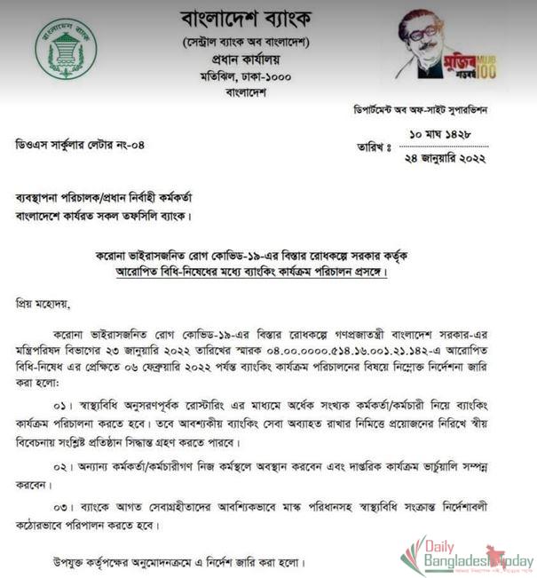 ১. স্বাস্থ্যবিধি অনুসরণ পূর্বক রোস্টারিং এর মাধ্যমে অর্ধেক সংখ্যক কর্মকর্তা/কর্মচারী নিয়ে ব্যাংকিং কার্যক্রম পরিচালনা করতে হবে। তবে, আবশ্যকীয় ব্যাংকিং সেবা অব্যাহত রাখার নিমিত্তে প্রয়োজনের নিরিখে স্বীয় বিবেচনায় সংশ্লিষ্ট প্রতিষ্ঠান সিদ্ধান্ত গ্রহণ করতে পারবে।